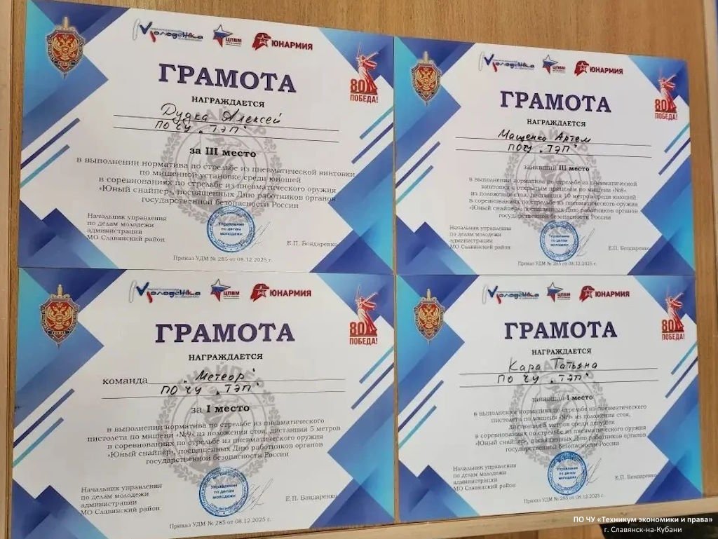 Команда Техникума экономики и права 16 декабря 2025 года приняла участие в соревнованиях по стрельбе из пневматического оружия «ЮНЫЙ СНАЙПЕР», посвященных Дню работников органов государственной безопасности России.