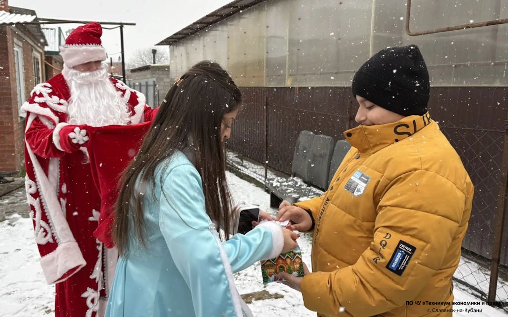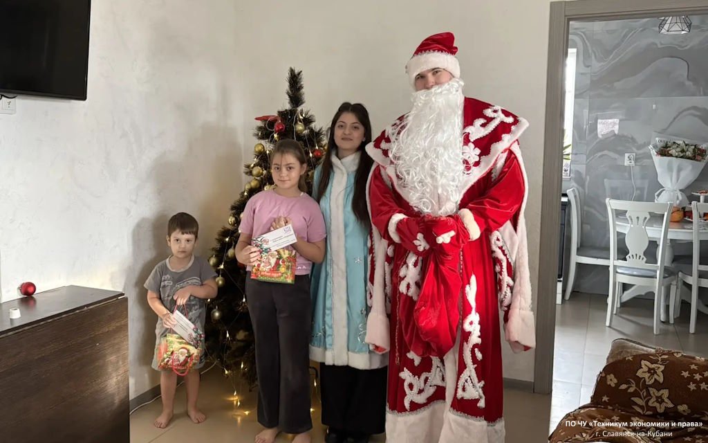 Техникум экономики и права не остался в стороне. Было организовано поздравление семей студентов, в которых члены семьи выполняют воинский долг на СВО. В рамках мероприятия Дед Мороз и Снегурочка посетили семьи и вручили маленьким детям сладкие подарки, создав атмосферу праздника и подарив ребятам радостные эмоции.